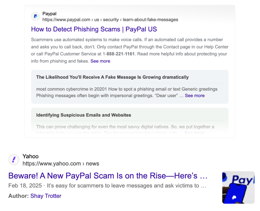 Side note: entering for the number provided in the scam email above (highlighted in yellow) in the search engine, spits out actual PayPal scam related sources such as: